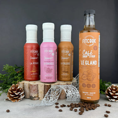 Une carte de Noël signé Le Fit Cook, des cartons recettes, ainsi que 3 sauces à desserts Fitcook Foodz (LA COLLEUSE, LA SENSUELLE, LA PITOUNE) ainsi que le sirop à café à la noisette LE GLAND.